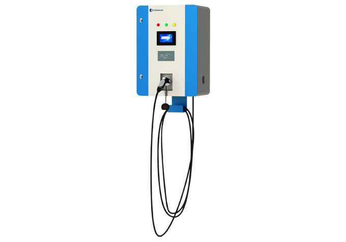 交流壁挂式充电桩(商用/家用两用),为电动汽车提供交流慢速充电。主要由人机交互单元、控制单元、计量单元、安全防护单元组成,外观小巧美观。